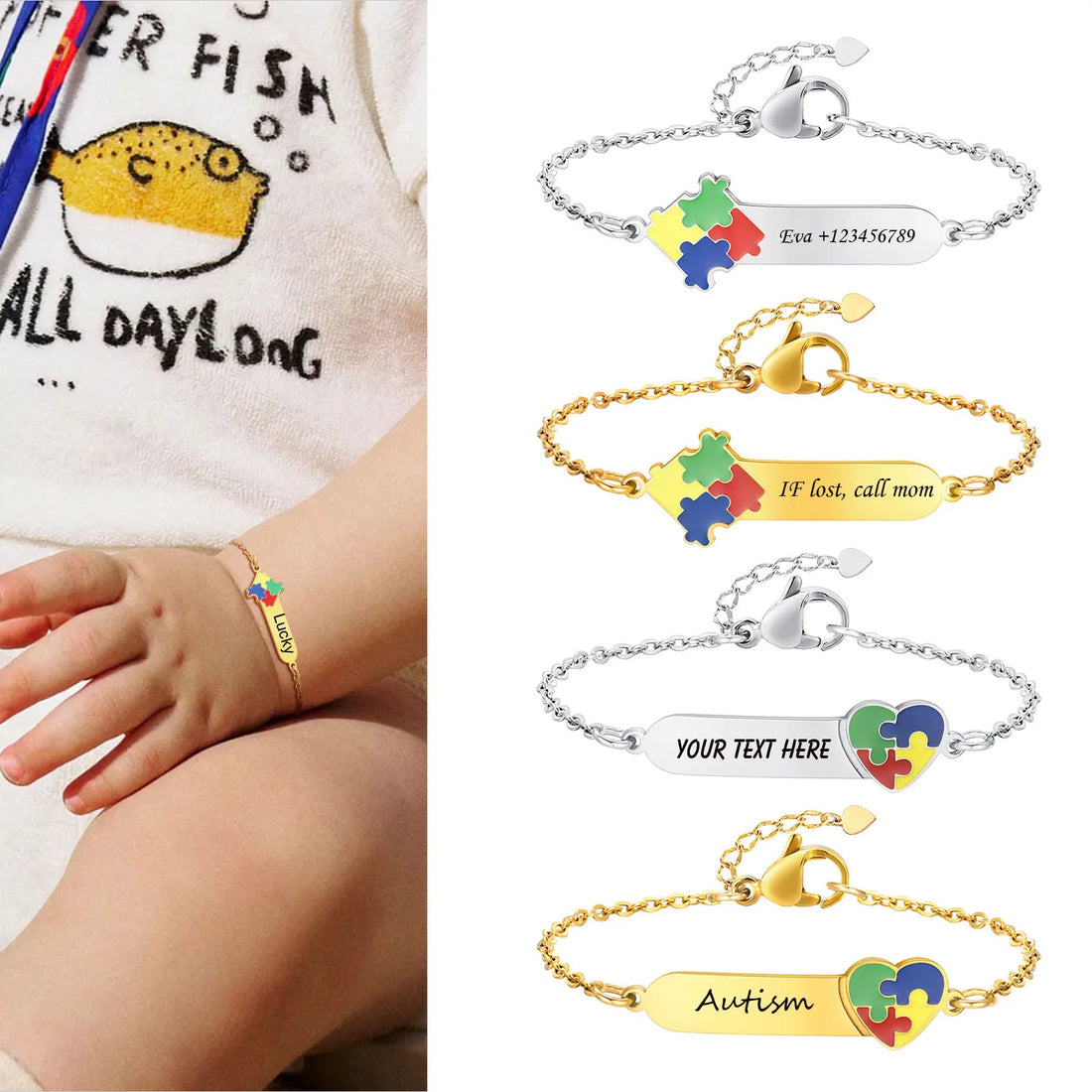 Personalized Autism Awareness Medical Alert Baby Kids Bracelets, Adjustable Link Stainless Steel, Enrgaved Emergency Jewelry