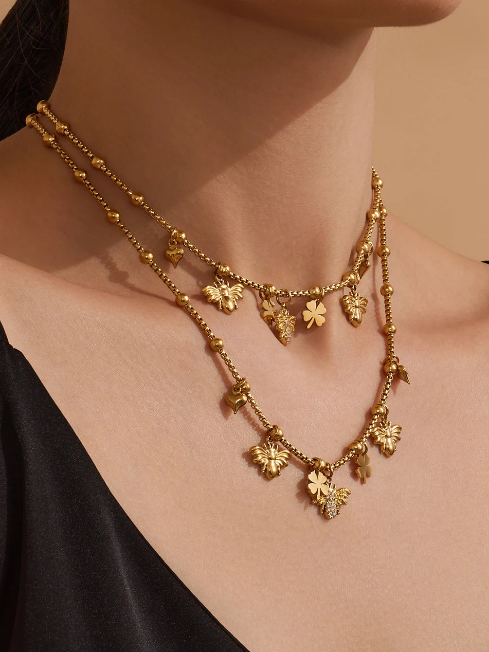 Nivora Popular Bee Pendant Necklace Bracelet Bangle for Women Stainless Steel 18K PVD Gold Plated Zircon No Tarnish Jewelry Sets