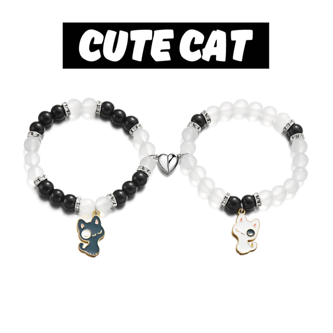 2pcs Magnetic Couple Bracelets Love Heart Shaped Matching Attraction Black White Cat Kitten Pendant Beaded Bracelet Jewelry Gift