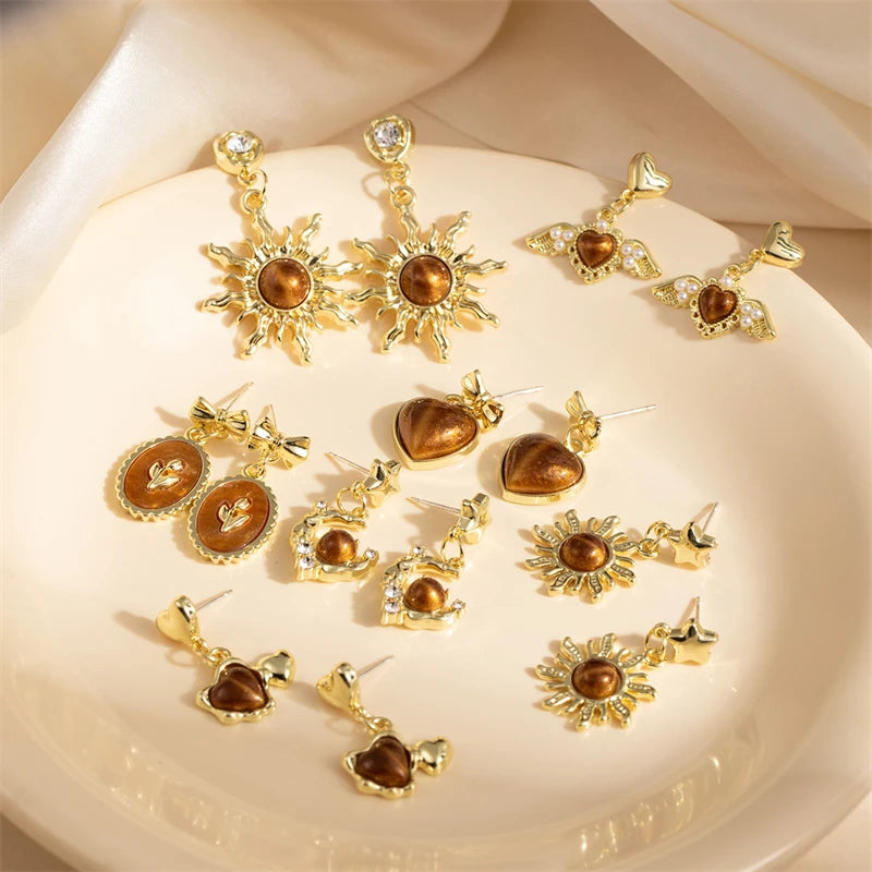 Vintage Coffee Color Tiger Eye Stone Stud Earrings for Women Girls Fashion Irregular Geometric Love Pearl Zircon Earring Jewelry