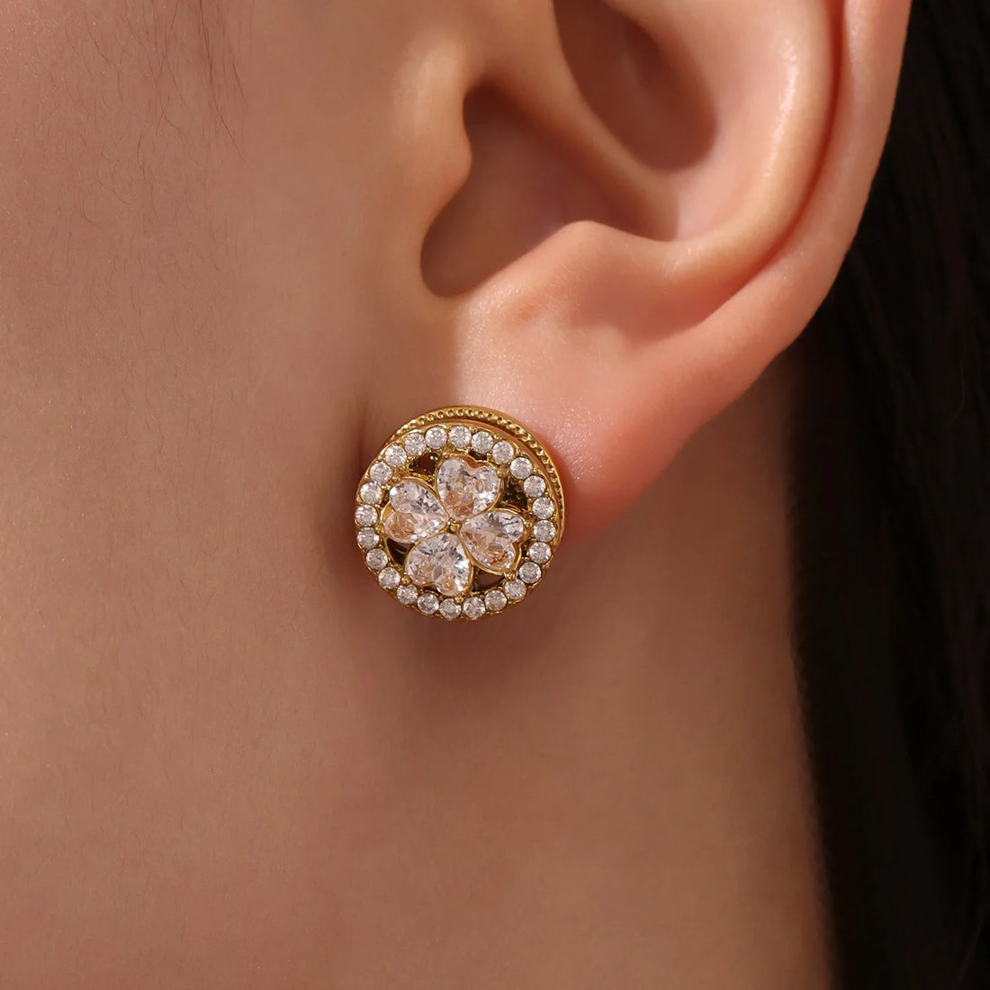 Vintage Elegant White Zircon Pearl Ear Studs 18K Gold Color Plated Stainless Steel Flower Earrings Women's Jewelry Party Gift