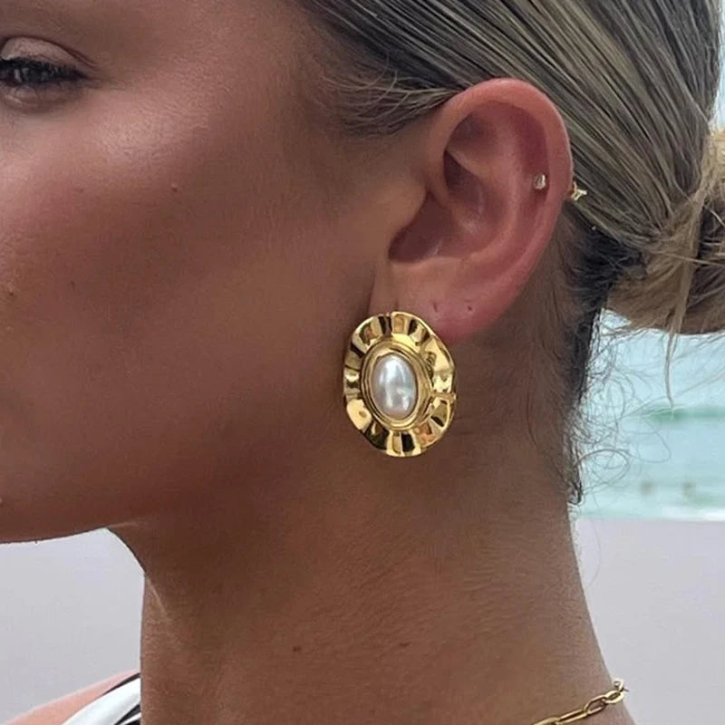 Uworld Chunky Round Gold Color Pearl Earrings Wedding Big Stud Earrings Natural Pearl Stud Earrings Wrinkled ladies' jewelry Gif