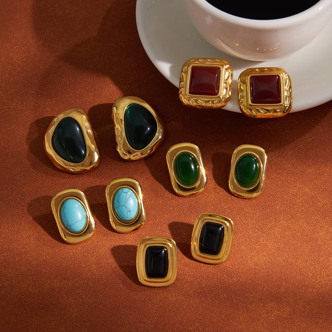 Uworld Vintage 18K Plated Gold Color Red Green Stone Geometry Ear Studs For Women Stainless Steel Earrings Waterproof Jewelry
