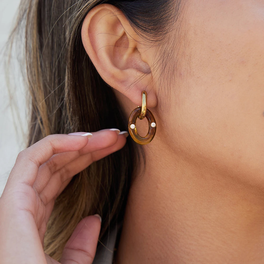 Uworld Vintage 18K Pvd Plated Gold Color Resin Amber Earrings With White Rhinestone Double-Loop Stainless Steel Earring