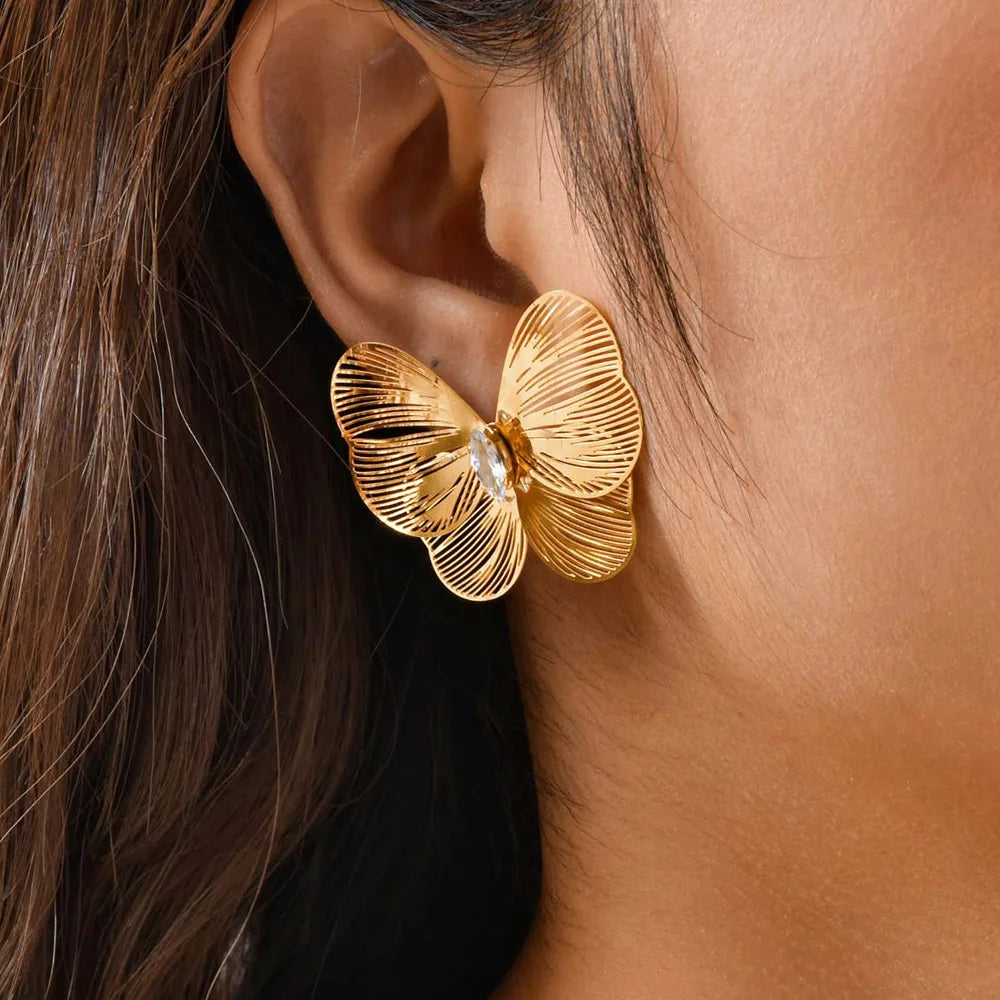 Butterfly Wing Earrings, Cubic Zirconia Hollow Big Butterfly Studs Earring for Women, One-Pair Stainless Steel Party Jewelry