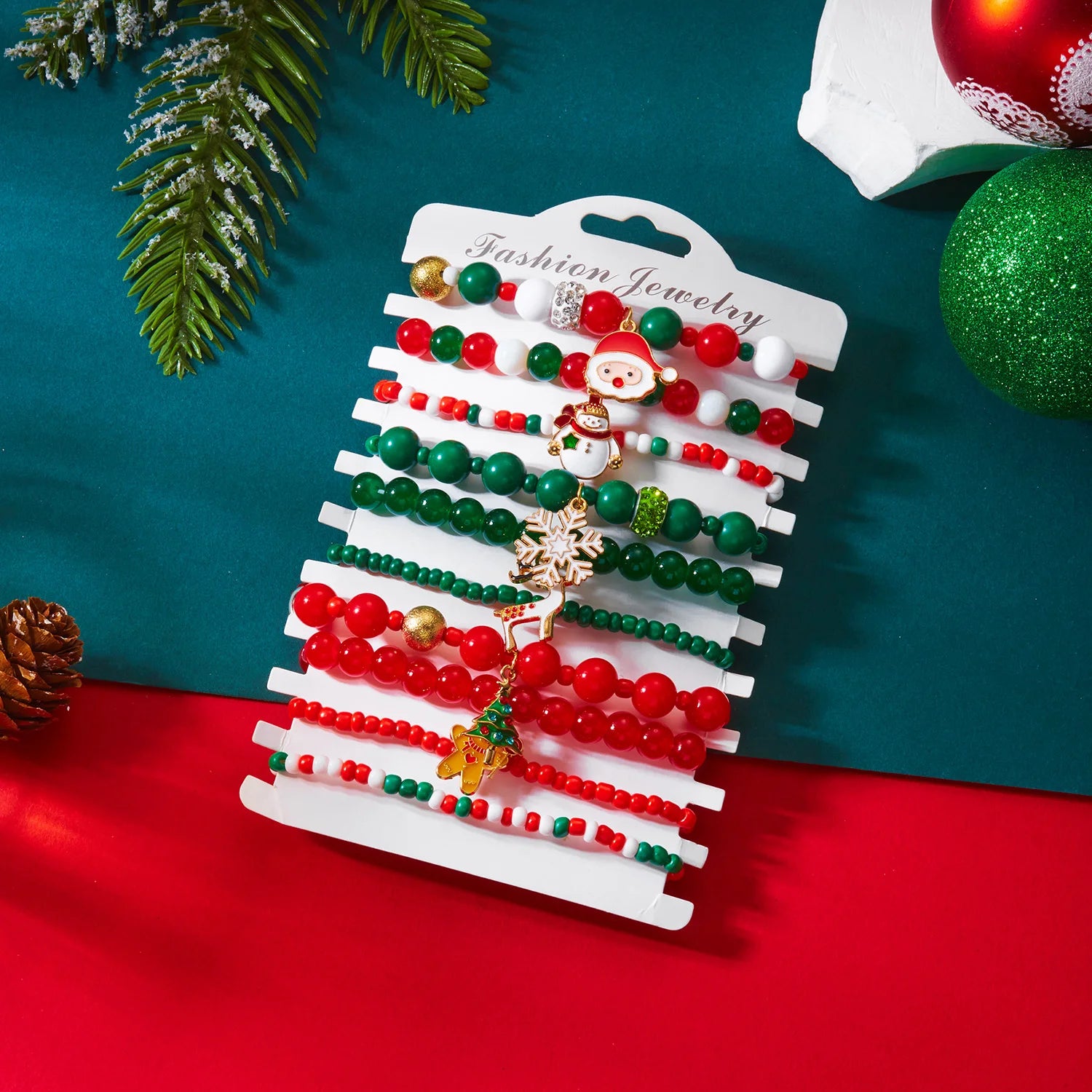10 Pcs Christmas Colorful Beaded Bracelet Set For Women Santa Claus Xmas Tree Snowflake Rice Beads Bangle Party Festival Jewelry