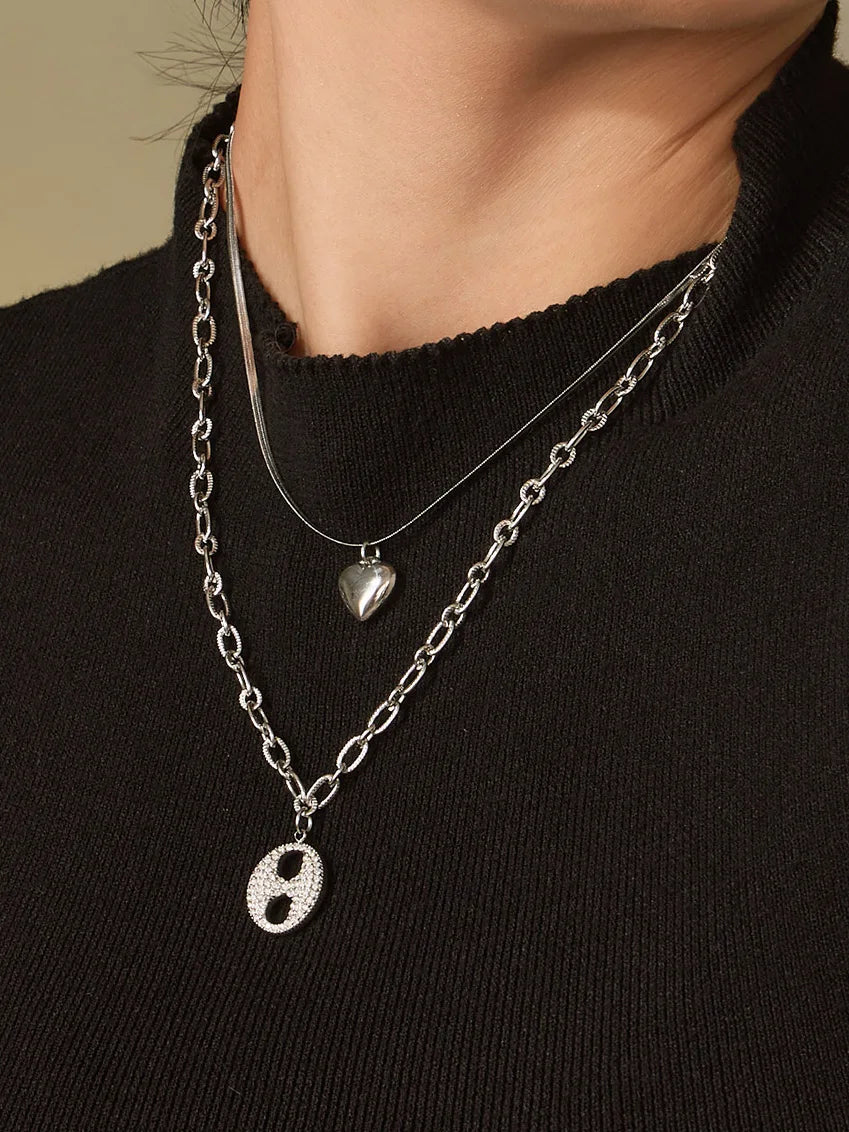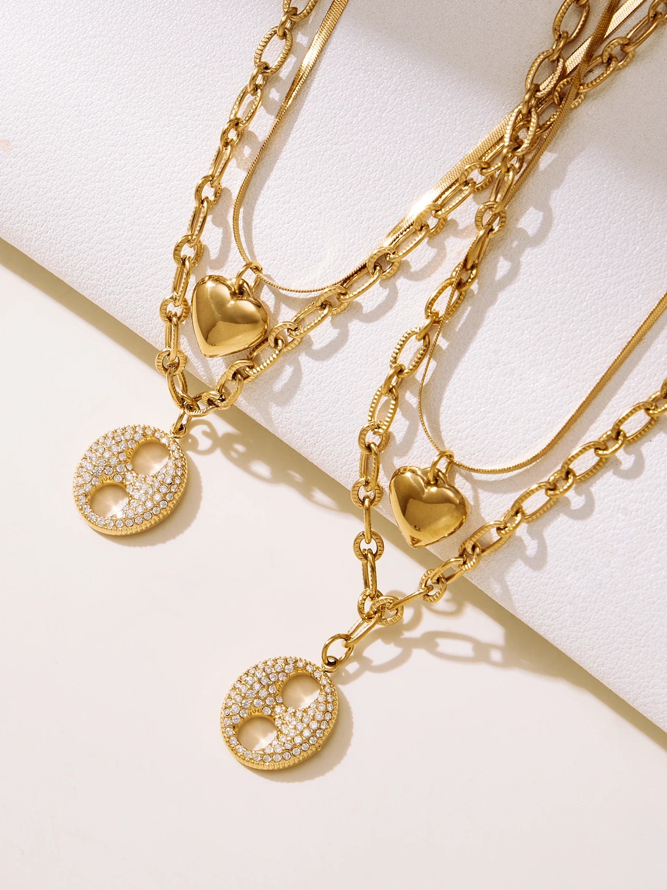 Nivora Cubic Zirconia Pig Nose Ring Women Necklaces Stainless Steel Heart Double Chain PVD Gold Plated Collar Choker Jewelry