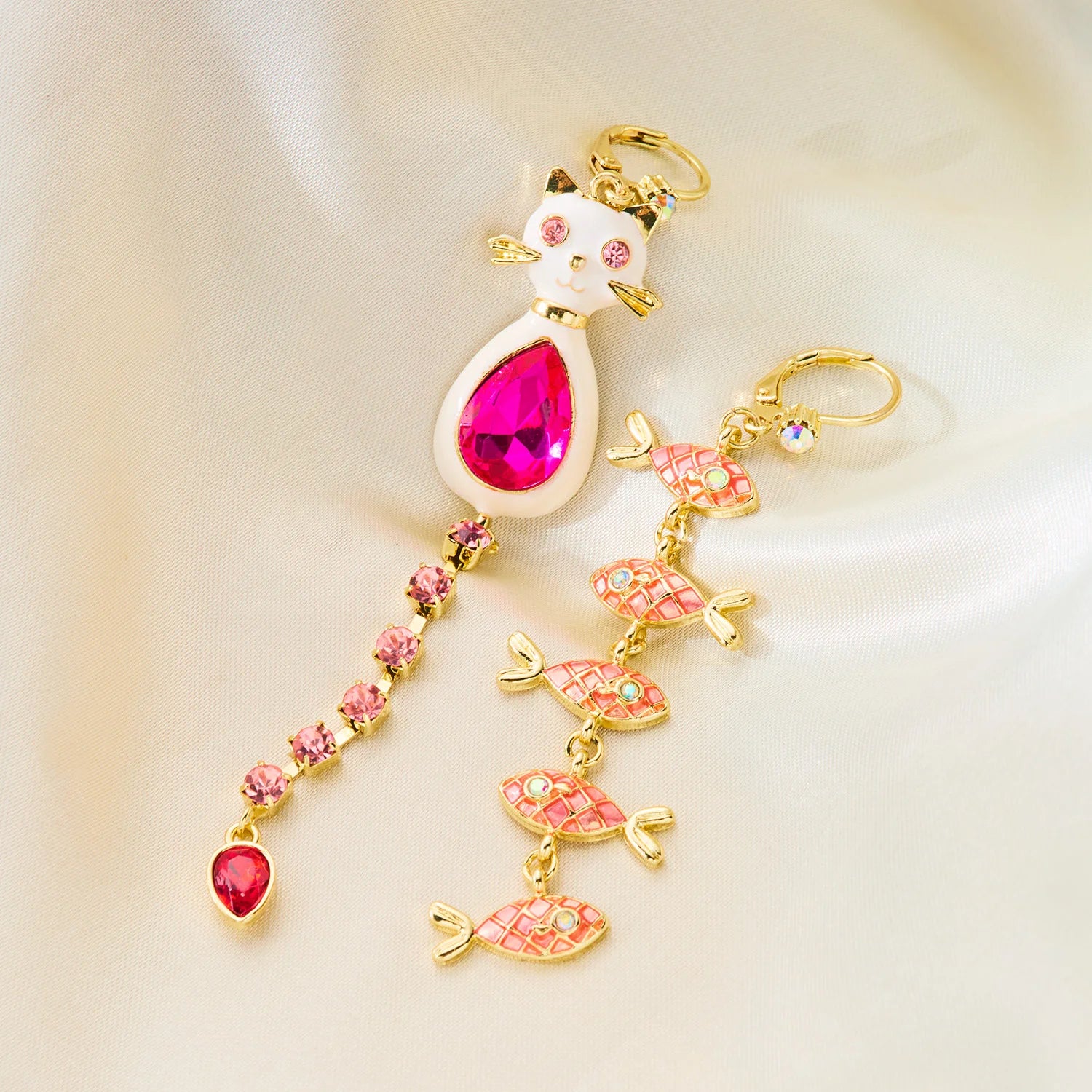 Shiny Rhinestone Kitten Fish Dangle Earrings For Women Asymmetric Long Tassel Cute Cat Fish Cartoon Earring Girls Party Jewelry