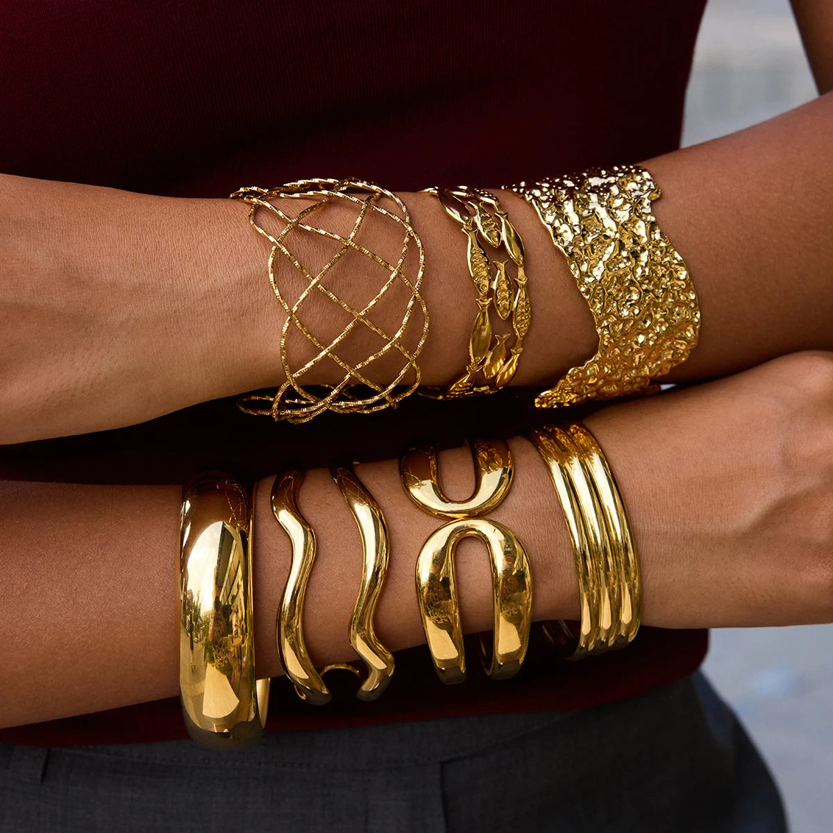 Uworld Minimalist 18K Gold Color Plated Stainless Steel Hammer Pattern Irregular Wide Face Bracelet Small Fish Line Multi Layer