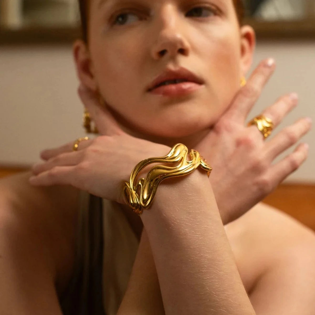 Uworld Waterproof 316l Stainless Steel Irregular Exaggerated Big Cuff Bracelet Bangle Stylish Unique Design Golden Charm