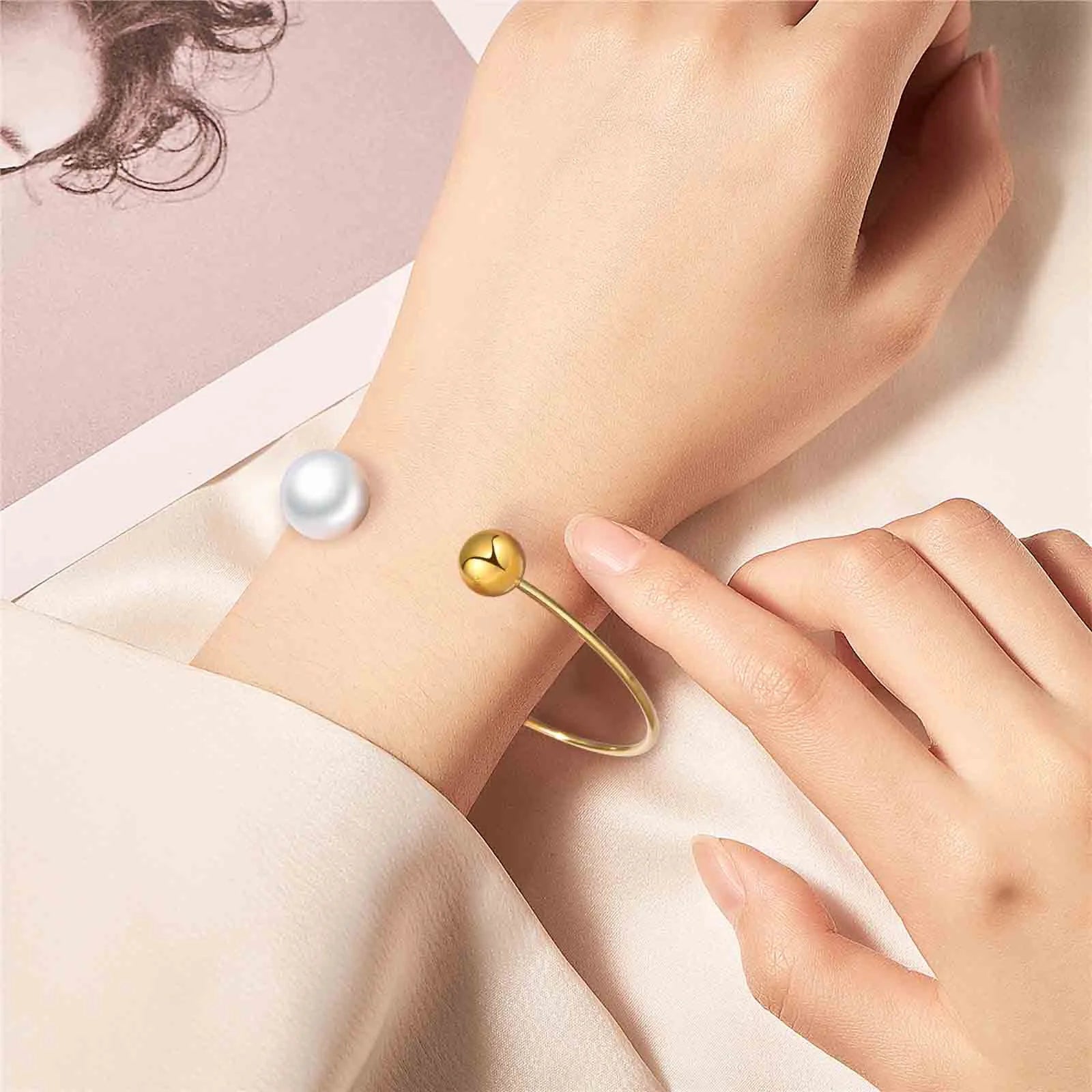 Women Trendy Cuff Bracelets, Gold Plated Stainless Steel Bangle Simulated Pearl Ball, Chic Minimalist Stylish Wristband Bracelet